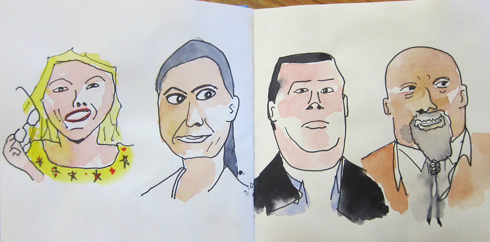 Liz Steel and Marc Taro Holmes initiated a fun challenge to sketch, paint or draw a hundred people in a week. The 2026 challenge ran from 9th-13th March (yes, I know, 5 days ! 😂) Anyhoo, here's my 100 (or so) people in urban sketch style line and wash, all in a 12x12cm sketchbook. Two 'brush only' selfies are in the mix 😃